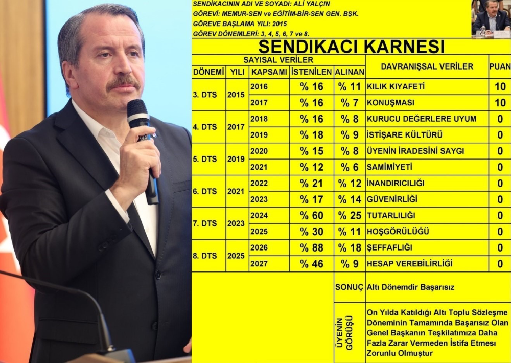 2015-2025 yılları arasında kurulan 6 Toplu Sözleşme Masasında Kamu İşveren Heyetine başkanlık eden Sayın Bakanlardan son iki dönem hariç, süreklideğişirken kamu görevlileri heyet başkanı ise tüm dönemlerin değişmeyen isimi olan Ali Yalçın'dı.10 yıl boyunca gerçekleştirilen her toplu sözleşmede, emekçilerin umudunu boşa çıkarmasına rağmenmemurları ve memur emeklilerini aynı ismin temsil etmesi dikkatleri sendika seçimlerine çevirmiştir. Eğer 1.078.831 üyesiyle dünyanın en büyük emek örgütlerinden biri olan Memur-Sen'in genel başkanı sadece ve sadece 267 oy ile seçiliyorsa işte asıl dengesizlik budur. Temsildeki bu dengesizliğin giderilmesi gerektiğini hiçbir kimse göz ardı edemez. Görüşmeler boyunca yasanın sınırlıklarına sığınan Ali Yalçın, memuru ne derece temsil ettiğine hiç değinmemiştir.