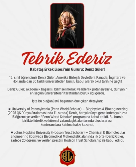 Kabataş Erkek Lisesi öğrencisi Deniz Güler, ABD, Kanada, İngiltere ve Hollanda'daki 30 seçkin üniversiteden burslu kabul alarak okul tarihine geçti. Güler, eğitimine Pennsylvania Üniversitesi'nde biyofizik ve biyomühendislik alanında çift anadal yaparak devam edecek. Kabataş Erkek Lisesi öğrencisi Deniz Güler, uluslararası akademik camiada eşine az rastlanır bir başarıya imza attı. Tam dört farklı ülkeden 30 seçkin üniversiteden burslu kabul alan Güler, okul tarihinde bir ilki başardı. Bu büyük başarının ardından eğitim hayatını ABD'nin prestijli kurumlarından Pennsylvania Üniversitesi'nde biyofizik alanında sürdürecek.