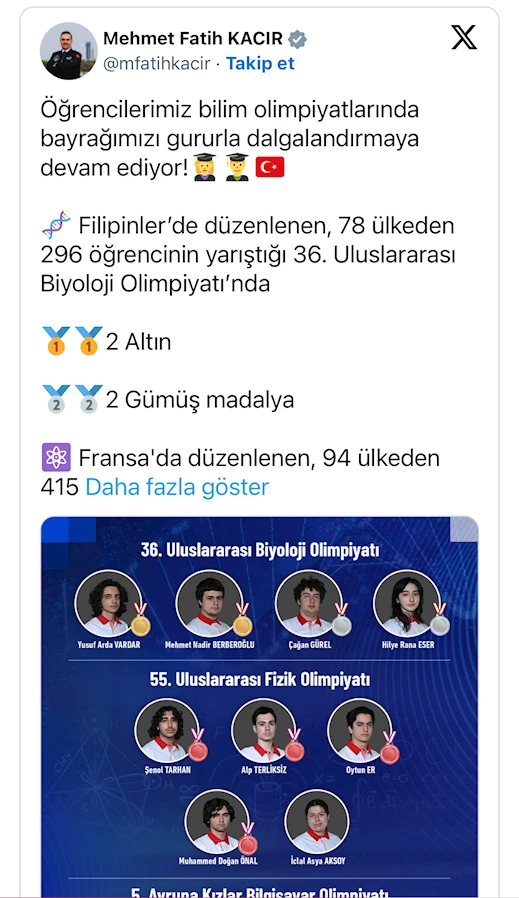 36. Uluslararası Biyoloji Olimpiyatı (Filipinler): 78 ülkeden 296 öğrencinin katıldığı bu zorlu yarışmada öğrencilerimiz 2 altın ve 2 gümüş madalya kazanarak büyük bir başarıya imza attı. Bu sonuç, Türk gençlerinin biyoloji alanındaki yetkinliğini kanıtladı.