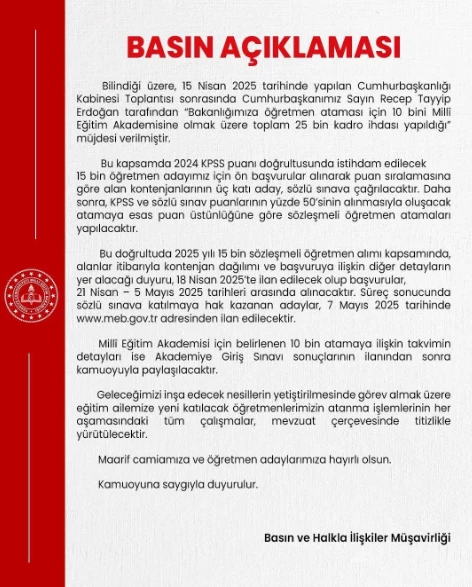 Bu süreçte adaylar, kendi alanlarına göre belirlenen kontenjanları öğrenerek başvurularını gerçekleştirecek. Sözlü sınav aşamasına geçiş yapacak öğretmen adayları ise 7 Mayıs’ta ilan edilecek liste üzerinden takip edilebilecek.