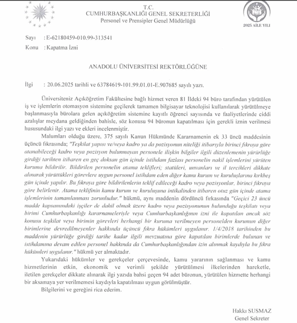 Cumhurbaşkanlığı kararıyla Anadolu Üniversitesi’ne bağlı Açıköğretim Fakültesi büroları kapatılıyor. 81 ilde faaliyet gösteren 94 büro, otomasyon sistemine geçişle birlikte devre dışı bırakılacak. Bürolarda görev yapan memurlar, talepleri doğrultusunda farklı kamu kurumlarına atanacak. Cumhurbaşkanlığı'ndan flaş bir karar geldi! Anadolu Üniversitesi'ne bağlı olarak 81 ilde açıköğretim hizmetlerini yürüten AÖF büroları, tamamen otomasyon sistemine geçilmesi nedeniyle kapatılıyor. Bu kararla birlikte, binlerce kamu görevlisinin de Çalışma ve Sosyal Güvenlik Bakanlığı tarafından talepleri doğrultusunda farklı kurumlara atanacağı duyuruldu. Açıköğretim sisteminde çığır açacak bu dijital dönüşümün tüm detayları haberimizde...