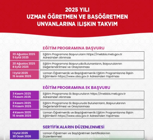 | 1 Eylül 2025 - 15 Aralık 2025 | Uzman Öğretmenlik ve Başöğretmenlik Eğitim Programlarına İlişkin Eğitimlerin https://www.oba.gov.tr Adresinden Yapılması | |