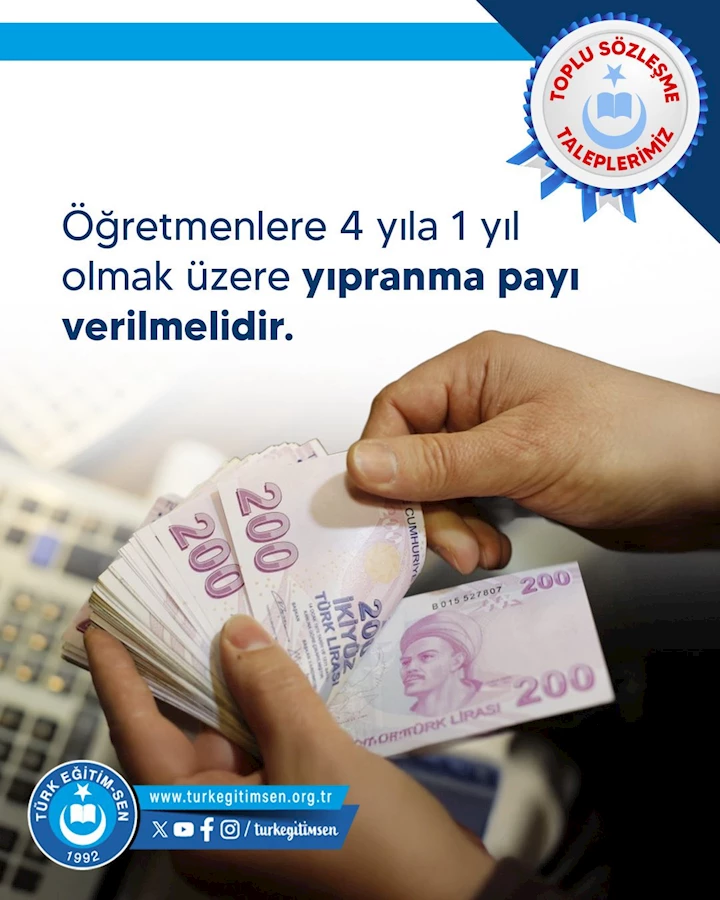 Türk Eğitim Sen tarafından yapılan açıklamada, öğretmenlik mesleğinin taşıdığı yoğun stres, fiziksel ve zihinsel yıpranma göz önünde bulundurularak, öğretmenlere "4 yıla 1 yıl olmak üzere yıpranma payı verilmesi" çağrısında bulunuldu. Bu talep, öğretmenlerin zorlu çalışma koşullarına bir nebze olsun denge getirmeyi ve emeklilik süreçlerinde daha avantajlı olmalarını sağlamayı hedefliyor.