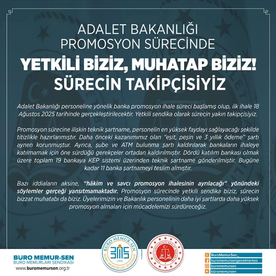 Adalet Bakanlığı personeline yönelik banka promosyon ihale süreci başlamış olup, ilk ihale 18 Ağustos 2025 tarihinde gerçekleştirilecektir. Yetkili sendika olarak sürecin yakın takipçisiyiz.