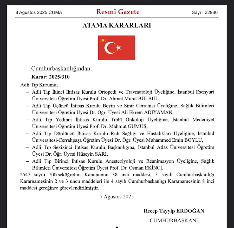 Cumhurbaşkanı Recep Tayyip Erdoğan imzalı atama kararına göre, alanında uzman isimler Adli Tıp Kurumu'nun farklı ihtisas kurullarında görevlendirildi. İşte yeni atamaların detayları: