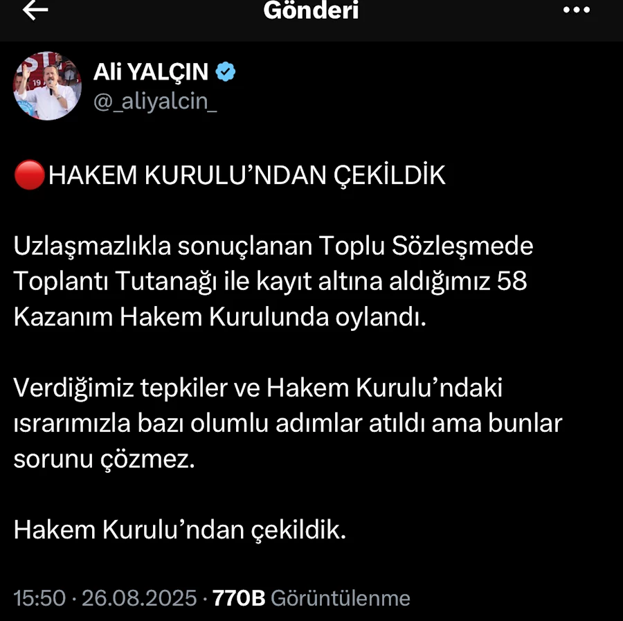 Memur Sen Genel Başkanı Ali Yalçın, toplu sözleşme görüşmelerinde maaş alma konusunda mutabakat da var olamaması ve hakem kurulu tarafından yapılan maaş zammını düşük bulunması nedeniyle açıklama yaptı. Yalçın’ın X hesabı üzerinden yaptığı açıklama şöyle:
