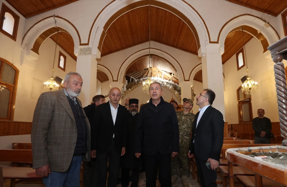 HATAY (AA) - Milli Savunma Bakanı Hulusi Akar, depremden zarar gören Mar İlyas Kilisesi'nde incelemelerde bulundu, Papaz Abdullah Yumurta'dan bilgi aldı.