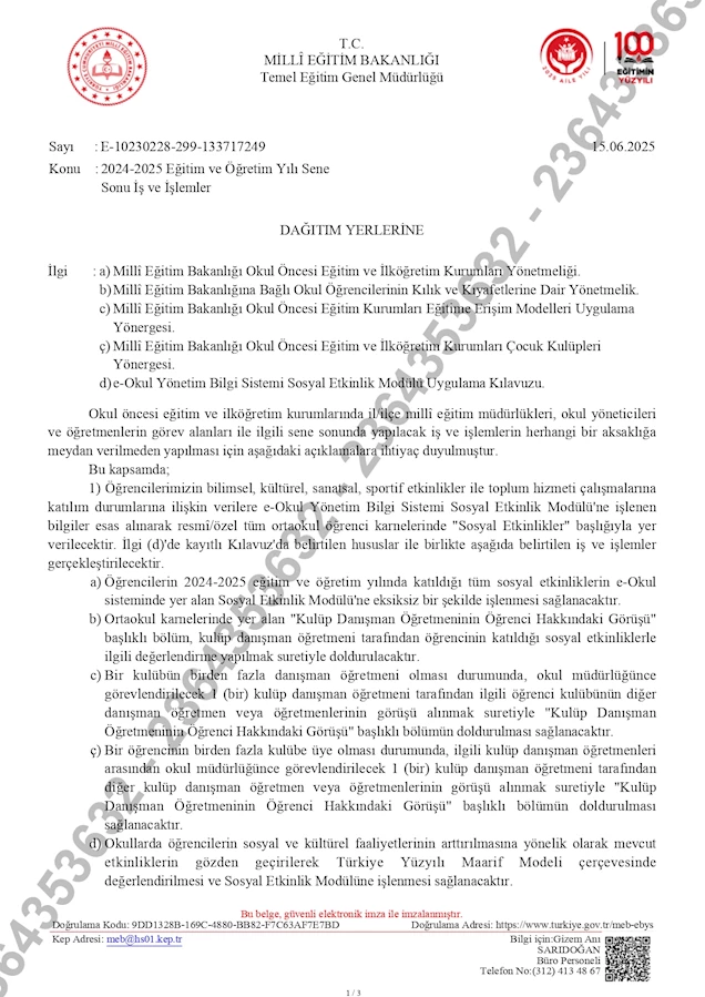 Milli Eğitim Bakanlığı Temel Eğitim Genel Müdürlüğü tarafından yayımlanan 15 Haziran 2025 tarihli ve 133717249 sayılı genelge, okulların kapanış süreci öncesinde yapılması gereken 11 önemli iş ve işlemi detaylandırıyor. İşte o maddeler: