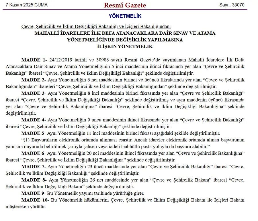 Mahalli idarelerin memur alım prosedürlerinde çığır açan bir gelişme yaşanıyor. Resmî Gazete'nin güncel sayısında neşredilen "Mahalli İdarelere İlk Defa Atanacaklara Dair Sınav ve Atama Yönetmeliğinde Değişiklik Yapılmasına İlişkin Yönetmelik" ile kamudaki istihdam süreçleri dijitalleşme yolunda kritik bir adım attı. Bu güncelleme, yalnızca başvuru metodunu değiştirmekle kalmıyor, aynı zamanda ilgili Bakanlığın adında da bir dönüşümü resmileştiriyor.