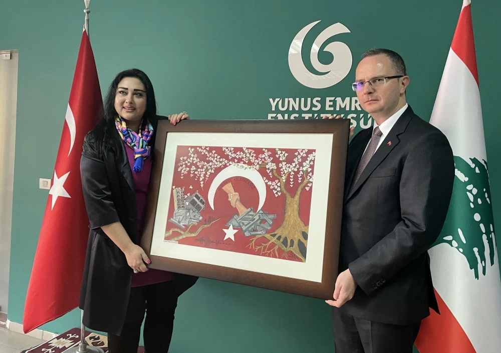 YEE'de öğrenci olan ressam Nesrin Abi Uli, çizdiği deprem konulu tablosunu Büyükelçi Ulusoy'a hediye etti.