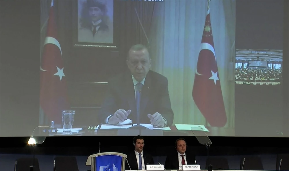 Erdoğan, AB Komisyonu ile AB Konseyi Dönem Başkanı İsveç'in, Türkiye ve Suriye'de depremlerden etkilenen bölgelere destek için düzenlediği "Uluslararası Bağışçılar Konferansı"na Cumhurbaşkanlığı Külliyesi'nden canlı bağlantıyla katıldı.