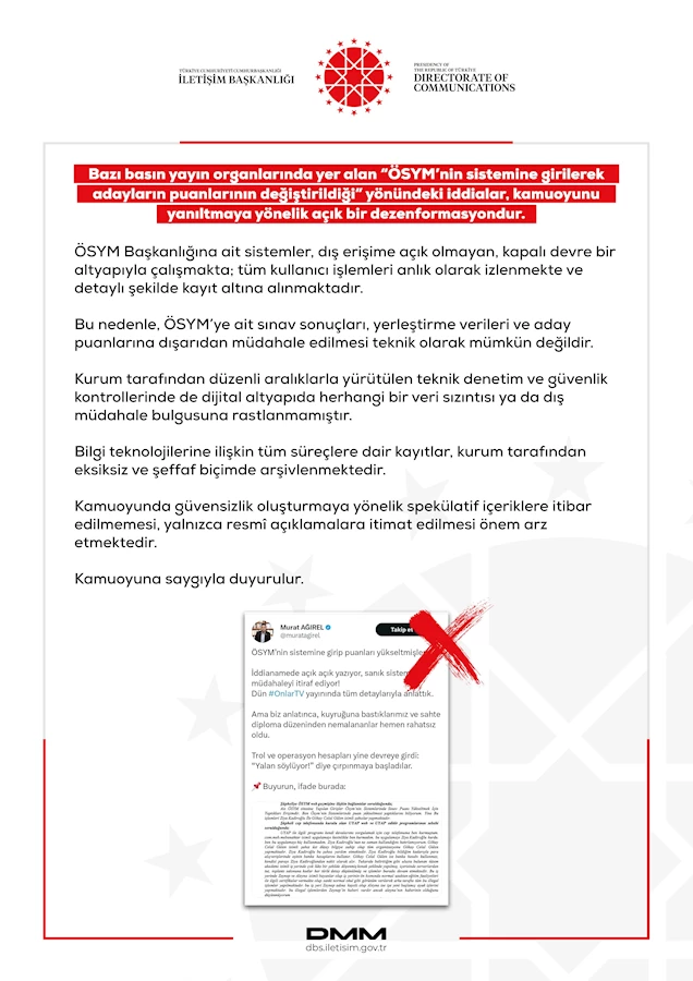 Dezenformasyonla Mücadele Merkezi (DMM), son zamanlarda hızla yayılan ve kamuoyunda kafa karışıklığına yol açan "ÖSYM sistemine girilerek adayların puanlarının değiştirildiği" iddialarını sert bir dille yalanladı. Yapılan resmi açıklamada, bu tür haberlerin "kamuoyunu yanıltmaya yönelik açık bir dezenformasyon" olduğu belirtilerek, ÖSYM'nin dijital altyapısının güvenliği konusunda net bilgiler verildi.
