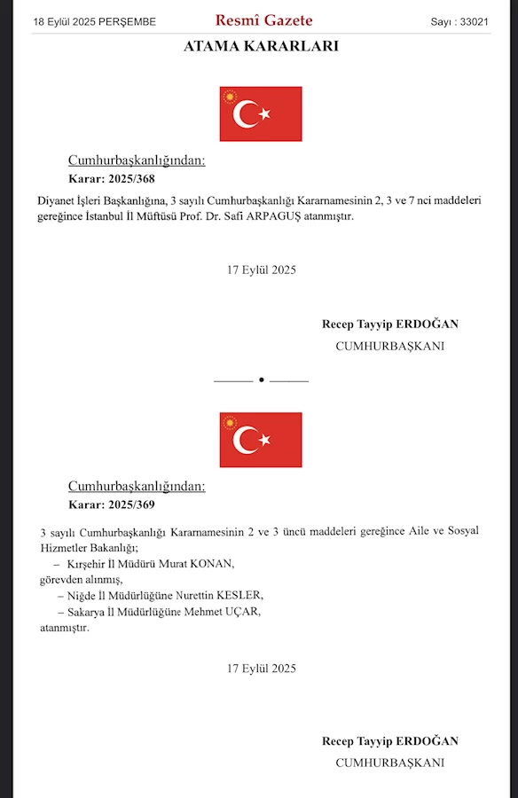 Diyanet İşleri Başkanı olarak görev yapan Ali Erbaş'ın görevden alındığı ve yerine yeni bir atama yapıldığı bilgisi, 18 Eylül 2025 tarihli Resmî Gazete'de yayımlanan kararla resmileşti. Cumhurbaşkanı Recep Tayyip Erdoğan tarafından imzalanan ve 33021 Sayılı Resmî Gazete'de yer alan bu karara göre, Diyanet İşleri Başkanlığı'na İstanbul İl Müftüsü Prof. Dr. Safi Arpaguş