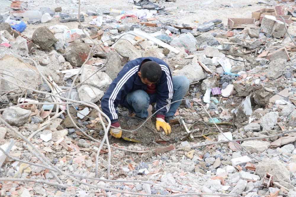 Enkaz kaldırma çalışmasının tamamlanmasını bekleyen Günhan, molozların içinden malzeme ve iş aletlerini çıkarabilme umuduyla arkadaşlarının da yardımıyla kazıya başladı.