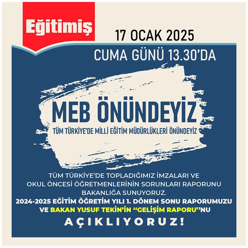 Eğitim ve Bilim İşgörenleri Sendikası (Eğitim-İş), okul öncesi öğretmenlerinin haklarına dikkat çekmek ve Milli Eğitim Bakanı Yusuf Tekin'in çalışma performansını değerlendirmek üzere 17 Ocak 2025 tarihinde Milli Eğitim Bakanlığı (MEB) önünde ve tüm illerdeki Milli Eğitim Müdürlükleri önünde eş zamanlı basın açıklaması yapacak.