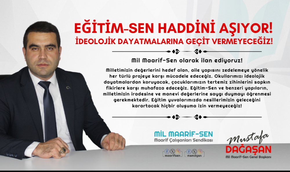 “Milletimizin değerlerini hedef alan, aile yapısını zedelemeye yönelik her türlü projeye karşı mücadele edeceğiz. Okullarımızı ideolojik dayatmalardan koruyacak, çocuklarımızın tertemiz zihinlerini sapkın fikirlere karşı muhafaza edeceğiz. Eğitim-Sen ve benzeri yapıların, milletimizin iradesine ve manevi değerlerine saygı duymayı öğrenmesi gerekmektedir. Eğitim yuvalarımızda nesillerimizin geleceğini karartacak hiçbir oluşuma izin vermeyeceğiz!”