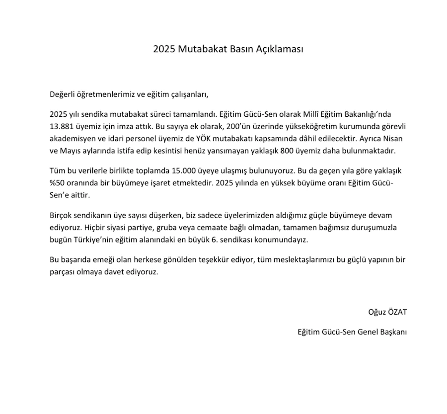 Eğitim Gücü-Sen Genel Başkanı Oğuz Özat, 2025 yılı sendika mutabakat sürecinin tamamlandığını duyurdu. Yayımladığı basın açıklamasında, sendikanın Milli Eğitim Bakanlığı (MEB) bünyesinde 13.881 üyeye ulaştığınımüjdeleyen Özat, bu sayının yanı sıra 200'ün üzerinde yükseköğretim kurumunda görevli akademisyen ve idari personel üyesinin de YÖK mutabakatı kapsamında dahil edileceğini belirtti. Nisan ve Mayıs aylarında istifa edip kesintisi henüz yansımayan yaklaşık 800 üyeyle birlikte toplamda 15.000 üyeye ulaşan Eğitim Gücü-Sen, geçen yıla göre yaklaşık yüzde 50'lik rekor bir büyüme oranı yakaladı.