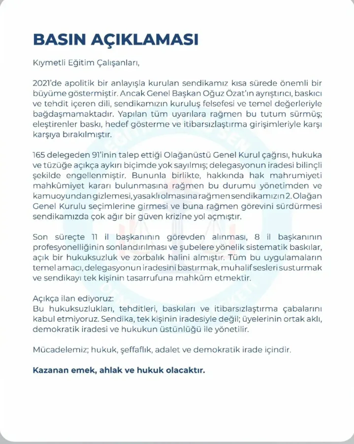 "Kuruluş Felsefesinden Uzaklaşıldı" Açıklamada, 2021 yılında apolitik bir anlayışla yola çıkan sendikanın kısa sürede büyüme kaydettiği ancak Genel Başkan Oğuz Özat’ın "ayrıştırıcı, baskıcı ve tehdit içeren dili" nedeniyle büyük bir itibar kaybı yaşadığı belirtildi. Eleştiride bulunan üyelerin baskı, hedef gösterme ve itibarsızlaştırma girişimleriyle karşı karşıya kaldığı vurgulandı.