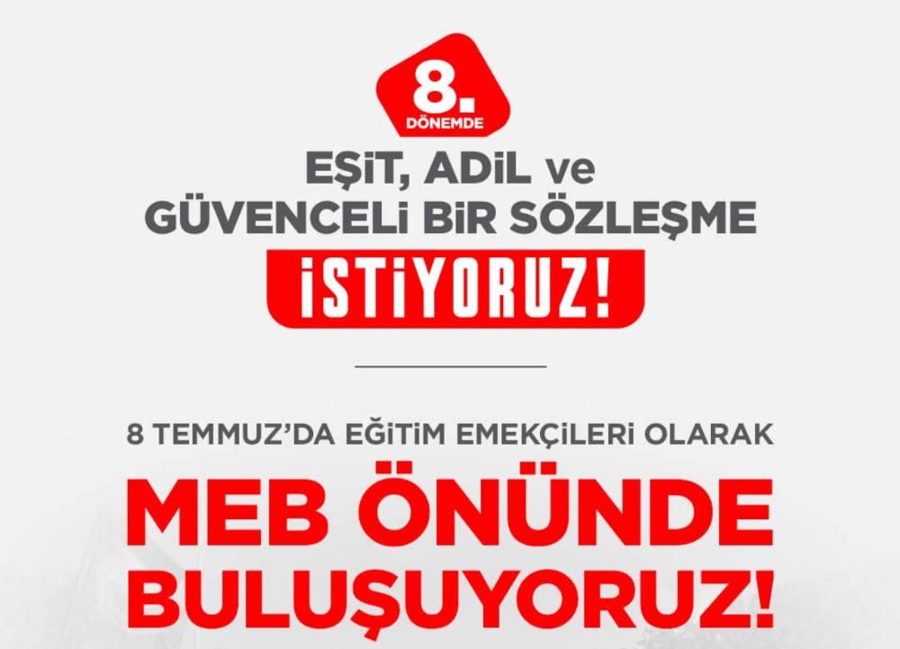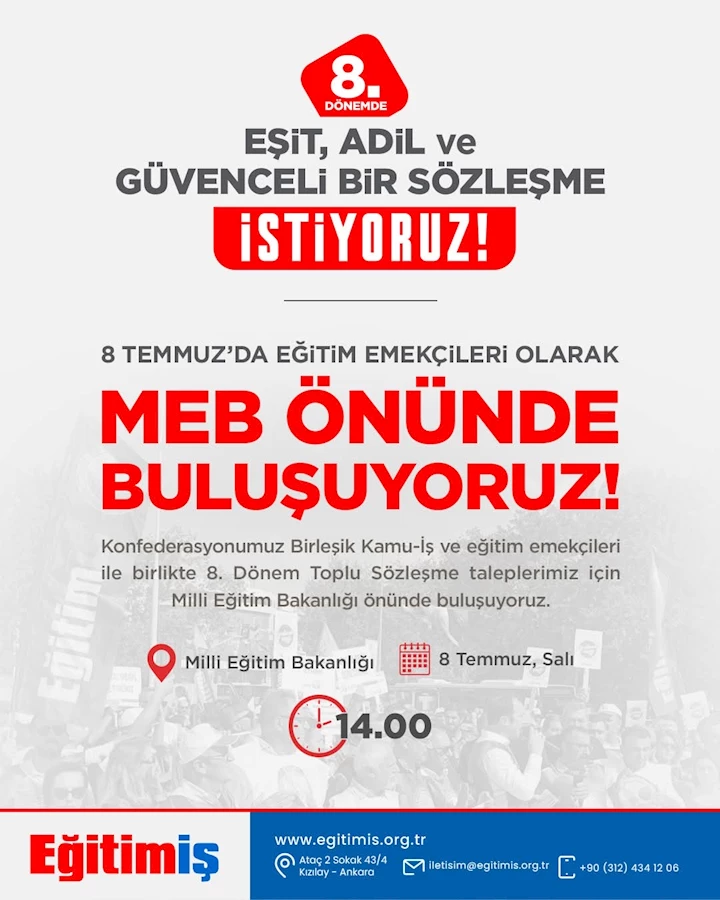 Eğitim-İş Sendikası tarafından yapılan çağrıda, sendikalara üye tüm eğitim emekçileri, ortak hak mücadelesine davet edildi. Açıklamada, "Eğitim emekçileri olarak haklarımız için bir araya geliyoruz!" ifadesi vurgulanırken, 8. Dönem Toplu Sözleşme sürecinde taleplerinin kararlılıkla dile getirileceği belirtildi.