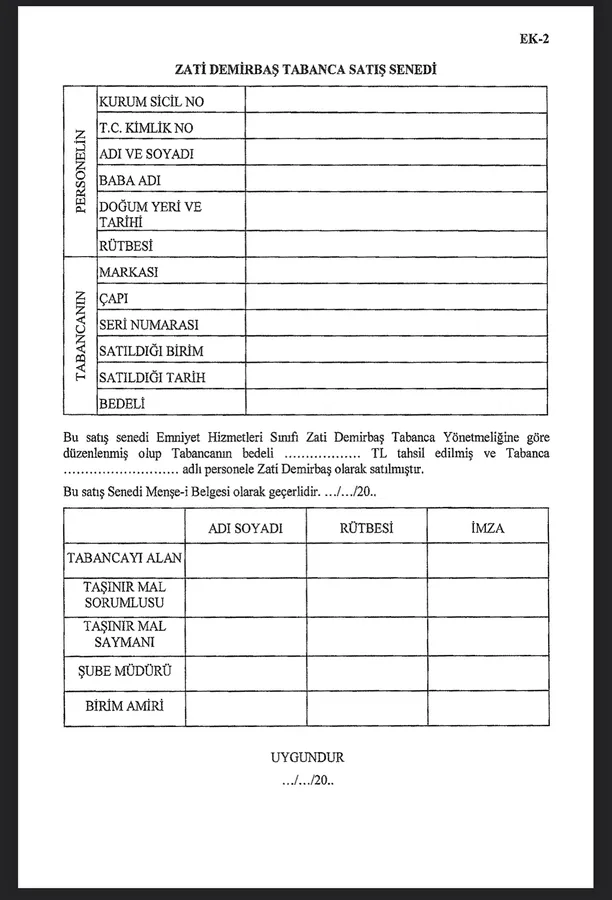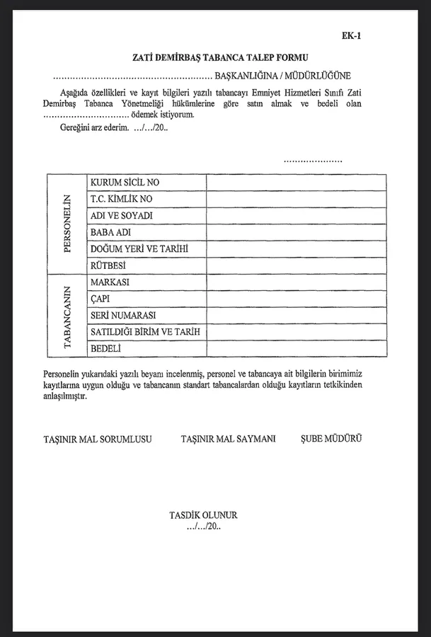 (2) Satışı yapılacak tabanca ve fişek bedeli, satışı yapan birimce düzenlenecek EK-1’de bulunan Zati Demirbaş Tabanca Talep Formuna göre aylık maaştan kesilir.