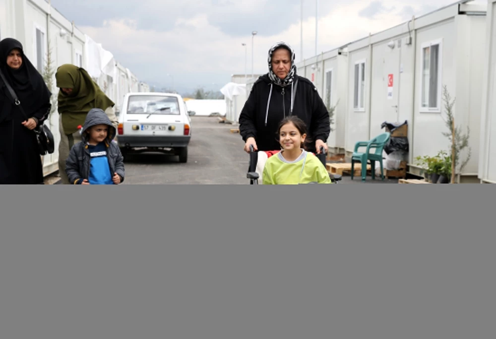 Melike, konteyner kentte yürüteç ve tekerlekli sandalye yardımıyla gezme imkanı buluyor.