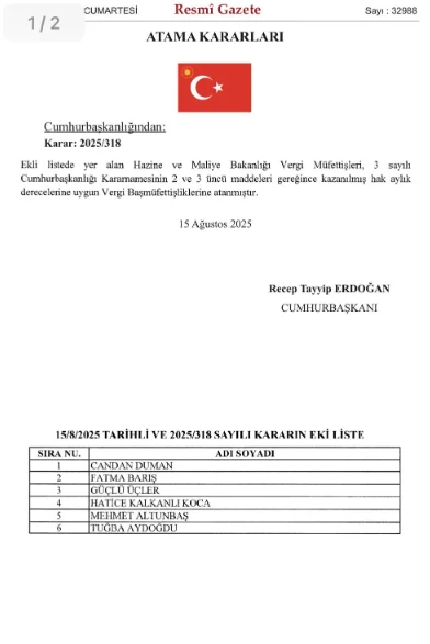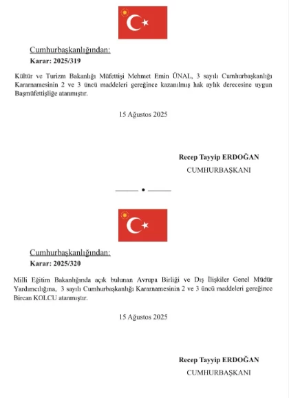 Cumhurbaşkanı Recep Tayyip Erdoğan’ın imzasını taşıyan ve 2025/318, 2025/319 ile 2025/320 sayılı numaralarla yayımlanan atama kararları, Resmî Gazete’nin bugünkü sayısında yer aldı. Kararlara göre, birçok kurum ve görevde önemli değişiklikler yapıldı. Türkiye Cumhuriyeti'nde üst düzey bürokratik atamalar, Cumhurbaşkanlığı kararnameleriyle Resmî Gazete'de yayımlanmaya devam ediyor. Cumhurbaşkanı Recep Tayyip Erdoğan'ın imzasıyla yayımlanan 2025/318, 2025/319 ve 2025/320 sayılı yeni atama kararları Resmî Gazete'nin bugünkü sayısında yer aldı. Bu kararlarla birlikte, devletin çeşitli kademelerinde önemli görev değişiklikleri resmileşmiş oldu.