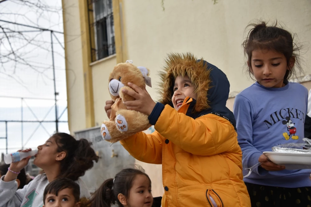 Çadır kentte kalan çocukların farklı bir yemek istediklerini öğrendiğini kaydeden Özültekin, "300 çocuğumuza yetecek kadar hamburger, içecek ve tatlı ikram ettik. Çocuklarımızın yüzündeki tebessümü görünce onlarla birlikte biz de mutlu olduk. Hayat devam ediyor ve artık normal hayatımıza dönmemiz gerekiyor. Bunu da birlik beraberlik içerisinde, yardımlaşmayla gerçekleştirebiliriz." diye konuştu.