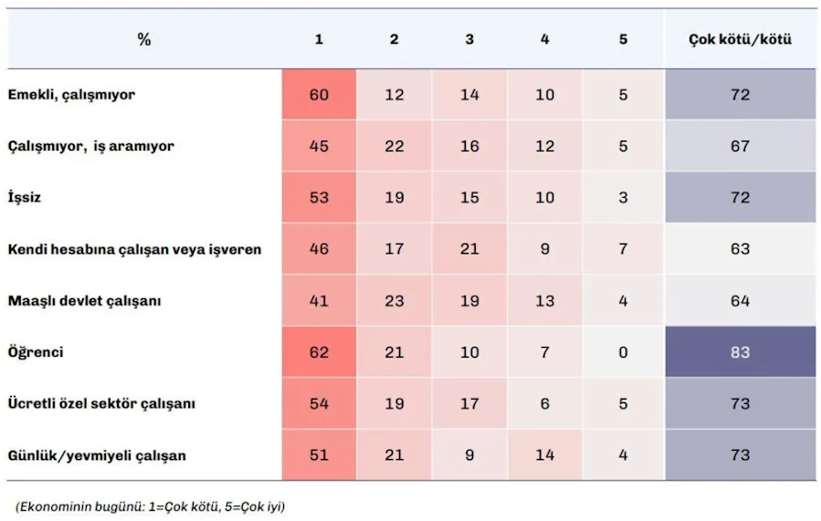 İş hayatına yeni atılacak gençler ve öğrenciler için ekonomik koşullar oldukça zorlayıcı hale gelmiş durumda. Öğrenciler arasında ekonomiyi “çok kötü” veya “kötü” olarak değerlendirenlerin oranı %83’e kadar yükseldi. Özel sektör çalışanları ve günlük işlerde çalışanlar da ekonomik beklentileri açısından en olumsuz kesimler arasında yer alıyor.