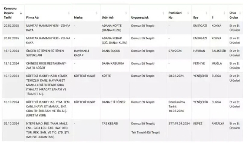 Gıda güvenliğiyle ilgili tartışmaların odağında olan Tarım ve Orman Bakanlığı, yürüttüğü denetimler sonucunda bazı işletmelerin et ürünlerinde ciddi aldatmacalara başvurduğunu ortaya çıkardı. Bakanlık tarafından yayımlanan listede, “dana eti” etiketiyle satılan ancak içeriğinde domuz eti bulunan ürünler kamuoyuna duyuruldu. Türkiye genelinde 7 farklı işletme bu hileli satışlarla tüketicileri yanılttı.