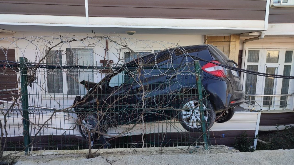 Otomobil, kot farkı bulunan evin yol hizasındaki balkonunda asılı kaldı.