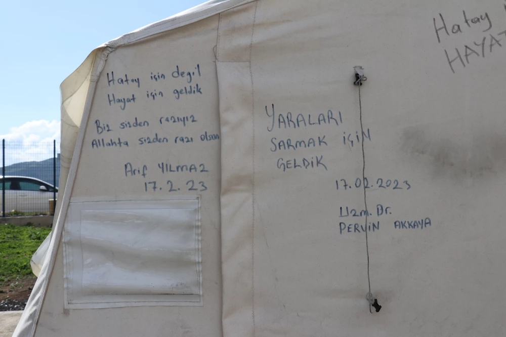 Türkiye'nin çeşitli illerinden Hatay'a gelerek arama kurtarma, gıda, çadır kurulumu ya da malzeme taşınması gibi işlerde görev alan yardım ekiplerinin çadır kentlerde yer alan çadırların üzerine yazdıkları umudu yansıtan notlar dikkati çekiyor.