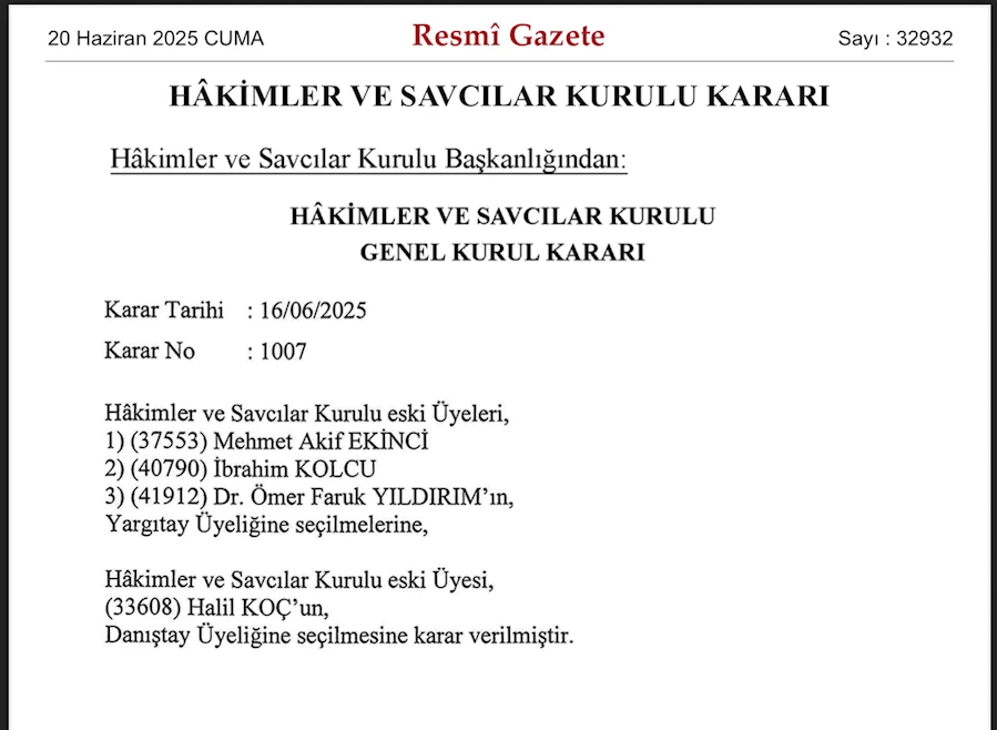 Türk yargı dünyasında önemli bir dönemeç yaşandı. Hâkimler ve Savcılar Kurulu (HSK) Genel Kurulu'nun aldığı kritik karar Resmi Gazete'de yayımlanarak yürürlüğe girdi. 16 Haziran 2025 tarihli karara göre, HSK'nın eski üyeleri Mehmet Akif Ekinci, İbrahim Kolcu ve Dr. Ömer Faruk Yıldırım Yargıtay üyeliğine seçilirken, Halil Koç ise Danıştay üyeliğine atandı. Bu atamalar, yüksek yargıda yeni bir dönemin habercisi olarak değerlendiriliyor.