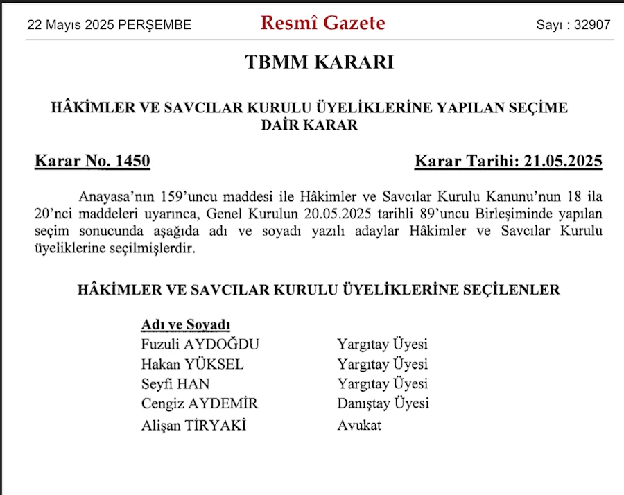 Türkiye Büyük Millet Meclisi (TBMM) Genel Kurulu'nda gerçekleştirilen seçimler sonucunda, Hakimler ve Savcılar Kurulu (HSK) üyeliklerine 5 yeni isim atandı. 21 Mayıs 2025 tarihli TBMM Kararı (Karar No: 1450), 22 Mayıs 2025 Perşembe tarihli Resmi Gazete'nin 32907 Sayılı sayısında yayımlanarak yürürlüğe girdi. Bu atamalar, yargı sisteminin işleyişi açısından büyük önem taşıyor.