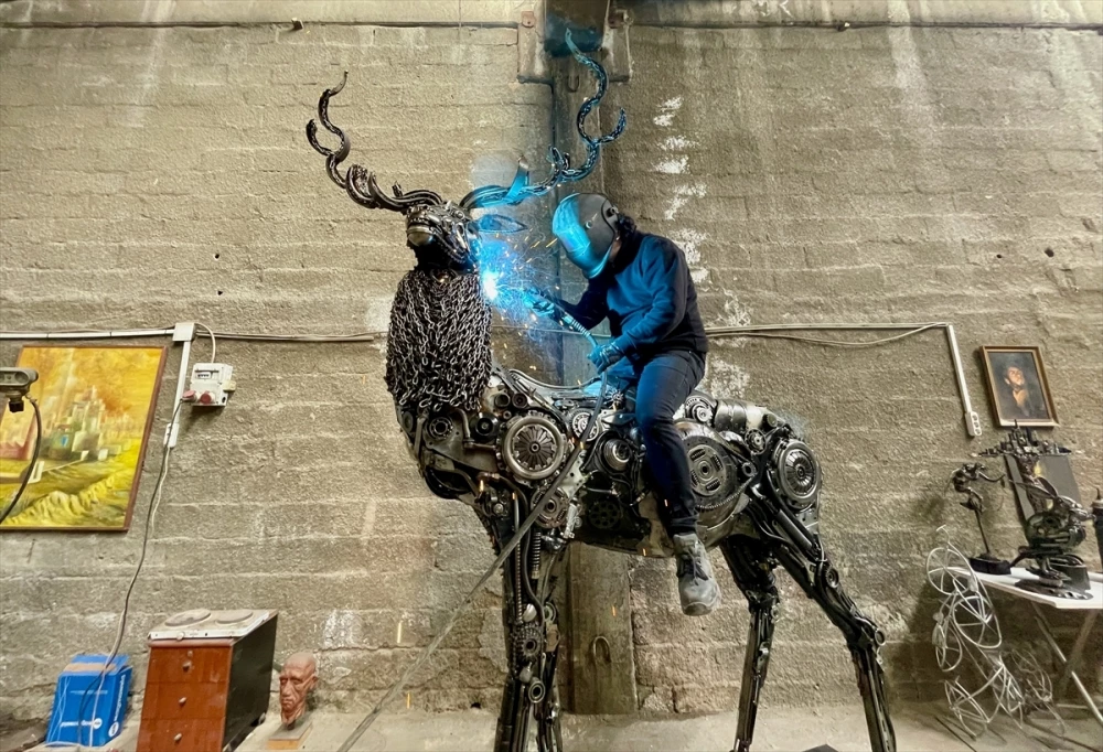 "Eserlerim sergilenip, farklı koleksiyonlarda yerini buldu. 2023 yılını da farklı bir eserle başlamak istedim. Bunun için de geyik figürünü seçtim. 3 metre yüksekliği, 2 metre 84 santimetre enine sahip. Geyik heykelimin ağırlığı 500 kilogramı buldu. Yaklaşık 3 bin geri dönüşüm metal malzemeyle ürettim. Otomobil, mutfak, dikiş makinesi parçalarını kullandım. İnsanların çöp ya da atık malzeme olarak gördüğü ömrünü bitirmiş parçalara geyik heykeliyle adeta ikinci hayatlarını verdim. Heykele Hitit kültüründeki geyik tanrısı Haruva'nın adını koydum."