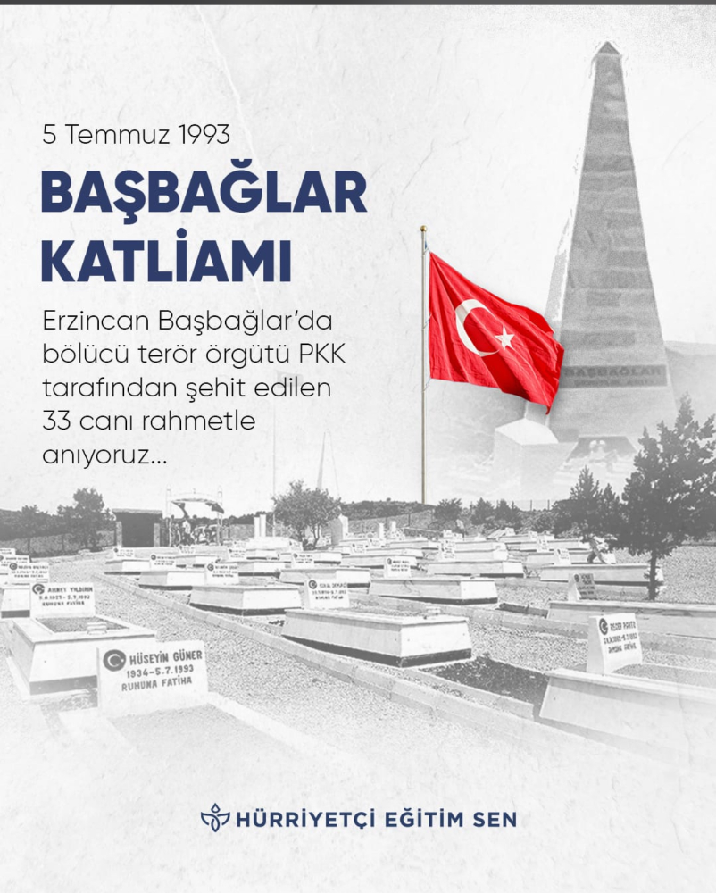 Hürriyetçi Eğitim Sen Sendikası, 32 yıl önce bugün, 5 Temmuz 1993'te Erzincan'ın Kemaliye ilçesine bağlı Başbağlar Köyü'nde terör örgütü PKK tarafından gerçekleştirilen katliamı unutmadığını bir kez daha tüm Türkiye'ye duyurdu. Sendika, sosyal medya üzerinden yayımladığı mesajla, bu acı olayda hayatını kaybeden 33 masum vatandaşa rahmet diledi, toplumsal hafızanın önemine vurgu yaptı.