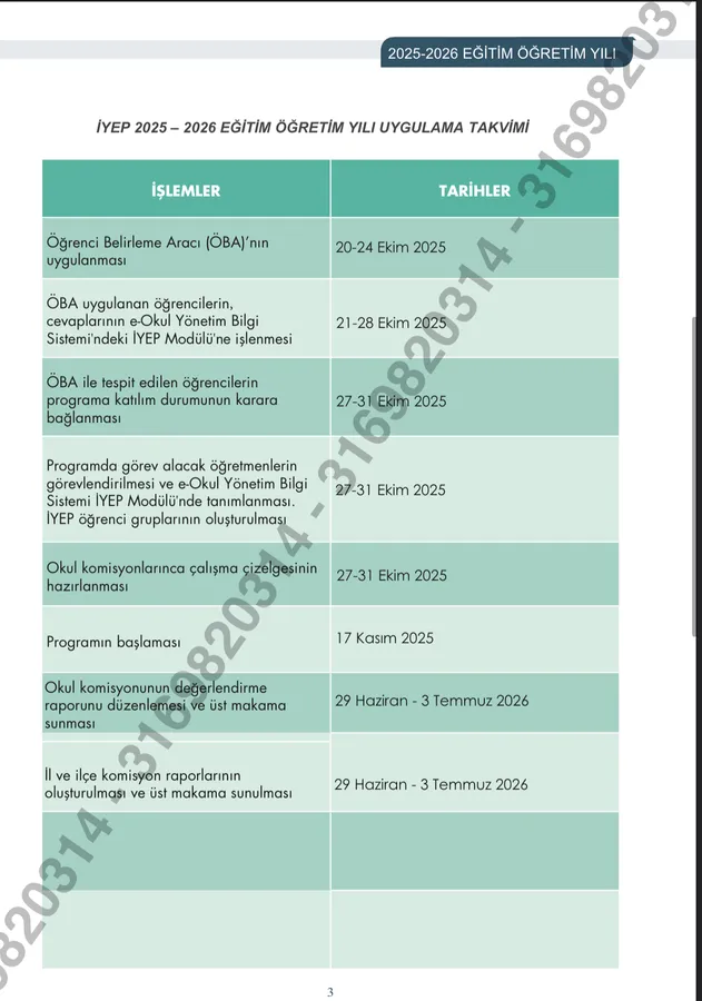 İYEP 2025-2026 Eğitim Öğretim Yılı Kilit Tarihleri