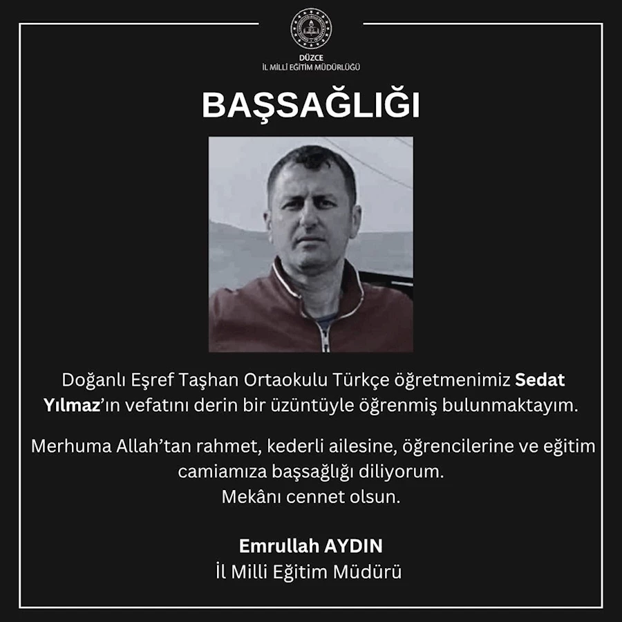 Düzce İl Milli Eğitim Müdürlüğü de, vefat eden öğretmen için resmi bir başsağlığı mesajı yayımladı. Mesajda, Sedat Yılmaz'a Allah'tan rahmet, kederli ailesine, öğrencilerine, meslektaşlarına ve tüm eğitim camiasına başsağlığı dilendi.