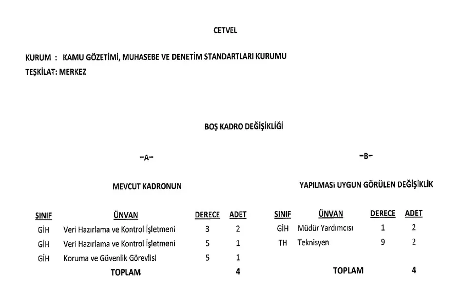 Kaldırılan Kadrolar: Fonksiyonunu yitiren veya Kurumun güncel ihtiyaçlarına uymayan bazı eski boş kadrolar ise listeden çıkarıldı.