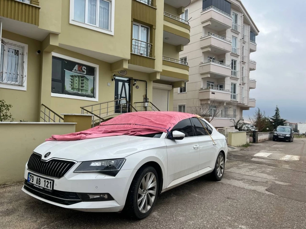 KİLİS (AA) - Kilis'te dün yağan ve bugün de etkili olması beklenen dolu nedeniyle vatandaşlar araçlarının üzerine halı ve karton sererek önlem almaya çalıştı.
