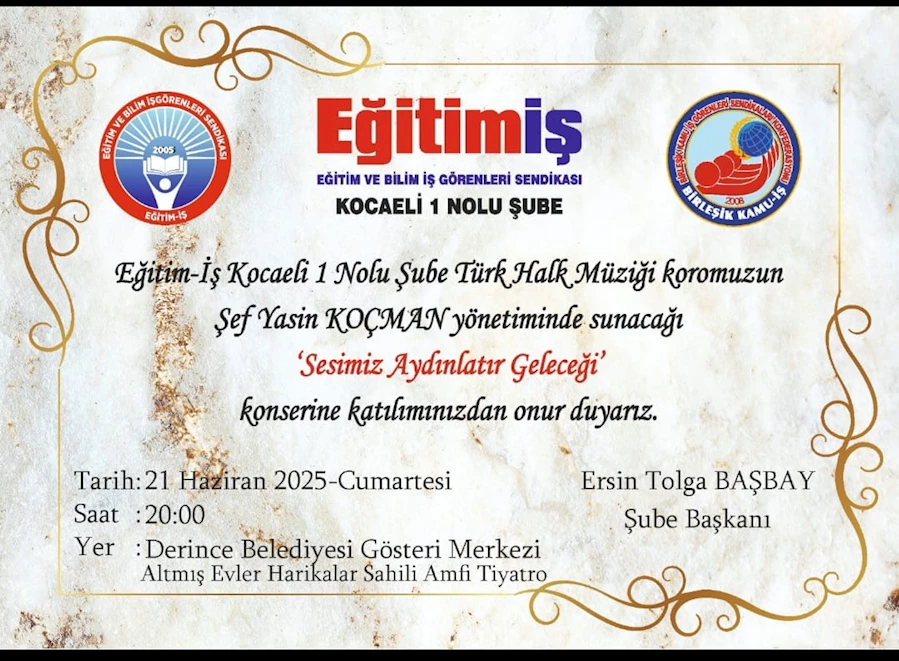 Kocaeli'de kültür ve sanat yaşamı, Eğitim ve Bilim İş Görenleri Sendikası (Eğitim-İş) Kocaeli 1 Nolu Şube'nin düzenleyeceği muhteşem bir konserle şenlenecek. Şef Yasin Koçman yönetimindeki Türk Halk Müziği Korosu, "Sesimiz Aydınlatır Geleceği" temalı özel bir konserle müzikseverlerin karşısına çıkmaya hazırlanıyor. Derince Belediyesi Gösteri Merkezi'nin ev sahipliği yapacağı bu özel geceye tüm Kocaeli halkı davet edildi.