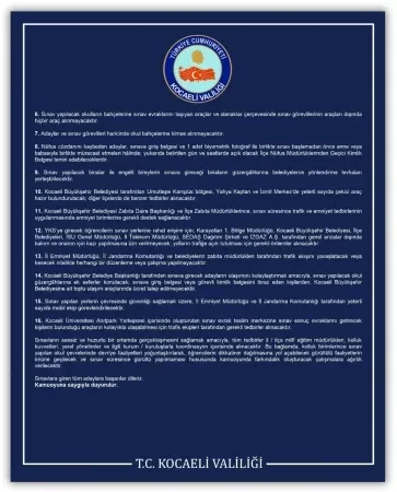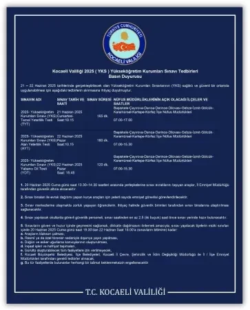 Kocaeli Valiliği, ÖSYM tarafından yapılacak olan YKS kapsamında sınav sürecine ilişkin önemli bilgileri paylaştı. İşte sınav süresince yapılacak iş ve işlemlere ilişkin o duyuru: