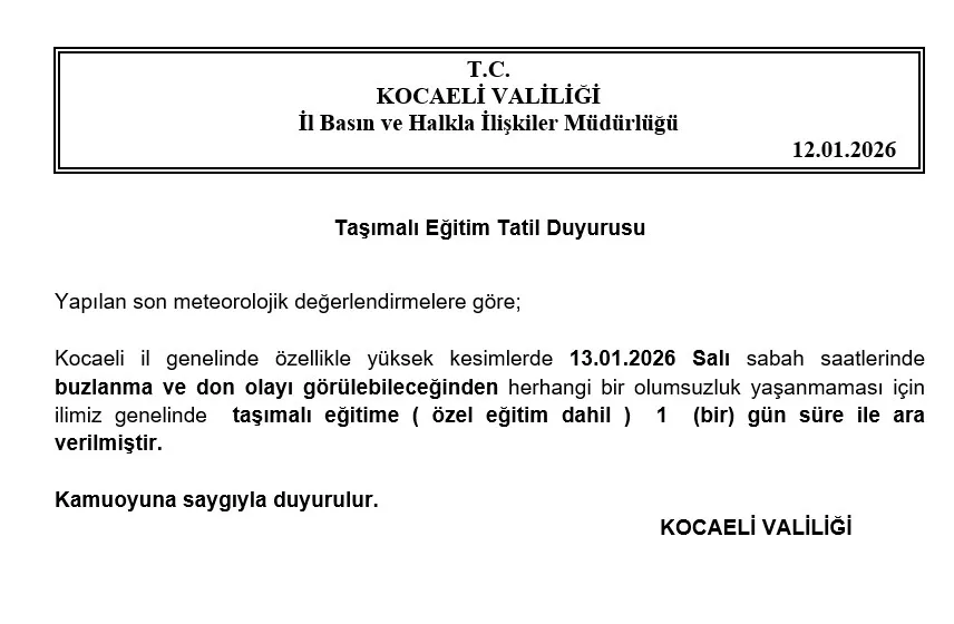 Kocaeli Valiliği, sosyal medya ve resmi internet sitesi üzerinden yaptığı duyuruda, herhangi bir mağduriyet yaşanmaması adına velilerin ve öğrencilerin resmi açıklamaları dikkate almalarını rica etti. Sabahın ilk ışıklarıyla birlikte yollarda oluşabilecek gizli buzlanmaya karşı sürücülerin de dikkatli olması gerektiği hatırlatıldı.