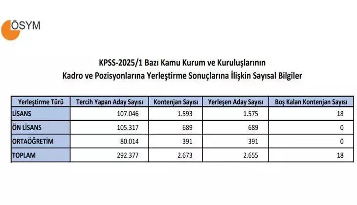 Yerleştirme sonuçlarına ilişkin sayısal bilgiler ve taban puanlar da adayların erişimine açıldı. KPSS 2025/1 yerleştirme taban puanlarına ulaşmak için ÖSYM'nin resmi internet sitesindeki ilgili duyuruya göz atabilirsiniz:https://www.osym.gov.tr/TR,33363/kpss-20251-bazi-kamu-kurum-ve-kuruluslarin-kadro-ve-pozisyonlarina-yerlestirme-sonuclarina-iliskin-sayisal-bilgiler.html