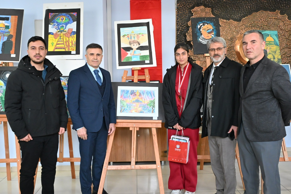 Programın başlangıcında, protokol üyeleri ve davetliler salon girişinde oluşturulan özel sergi alanını gezdi. Yarışma kapsamında il genelindeki ilk, orta ve lise öğrencilerinin kaleminden çıkan ve Mescid-i Aksa sevdasını tuvale yansıtan eserler büyük beğeni topladı.