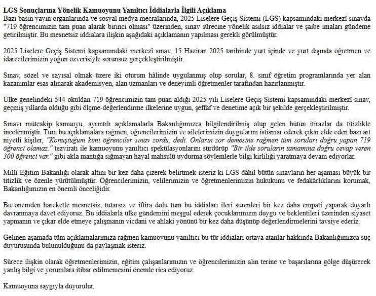 15 Haziran 2025’te gerçekleştirilen Liselere Geçiş Sistemi (LGS) sınavında 719 öğrencinin tam puan alması, sosyal medyada tartışma yaratırken, Milli Eğitim Bakanlığı sürecin şeffaf ve denetlenebilir olduğunu vurgulayarak kamuoyunu yanıltan iddialara karşı suç duyurusunda bulundu. Milli Eğitim Bakanlığı (MEB), 2025 Liselere Geçiş Sistemi (LGS) sınavında 719 öğrencinin tam puan almasının ardından ortaya atılan "şeffaflık" iddialarına kesin bir dille yanıt verdi. Bakanlık, sınav sürecinin en başından sonuna kadar titizlikle yürütüldüğünü ve asılsız iddiaları yayanlar hakkında yasal işlem başlatıldığını duyurdu. İşte MEB'in basın açıklamasıyla LGS sürecine dair tüm detaylar ve Bakanlığın iddialara karşı duruşu...