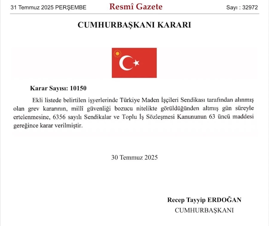Türkiye Maden İşçileri Sendikası tarafından alınan grev kararı, Cumhurbaşkanı Recep Tayyip Erdoğan’ın imzasıyla Resmi Gazete’de yayımlanan karar doğrultusunda 60 gün süreyle ertelendi. Kararın gerekçesi “milli güvenliği bozucu nitelik” olarak açıklandı. İşçi ve memur maaşlarına yönelik zam beklentileri ise 2027 yılına işaret ediyor. Türkiye Maden İşçileri Sendikası'nın aldığı grev kararı, Cumhurbaşkanı Recep Tayyip Erdoğan'ın imzasıyla Resmi Gazete'de yayımlanan kararla 60 gün süreyle ertelendi. Erteleme gerekçesi "milli güvenliği bozucu nitelikte" olması olarak açıklandı.