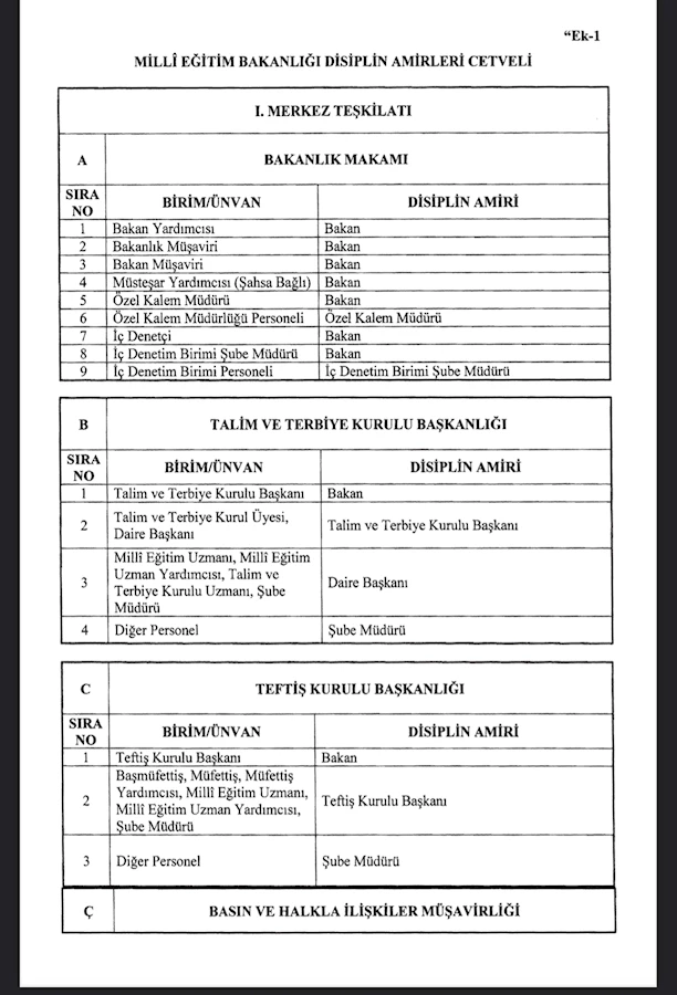 Talim ve Terbiye Kurulu Başkanlığı: Başkanın disiplin amiri Bakan, kurul üyeleri ve daire başkanlarının amiri Talim ve Terbiye Kurulu Başkanı olarak belirlendi. Diğer personelin amiri ise şube müdürü oldu.