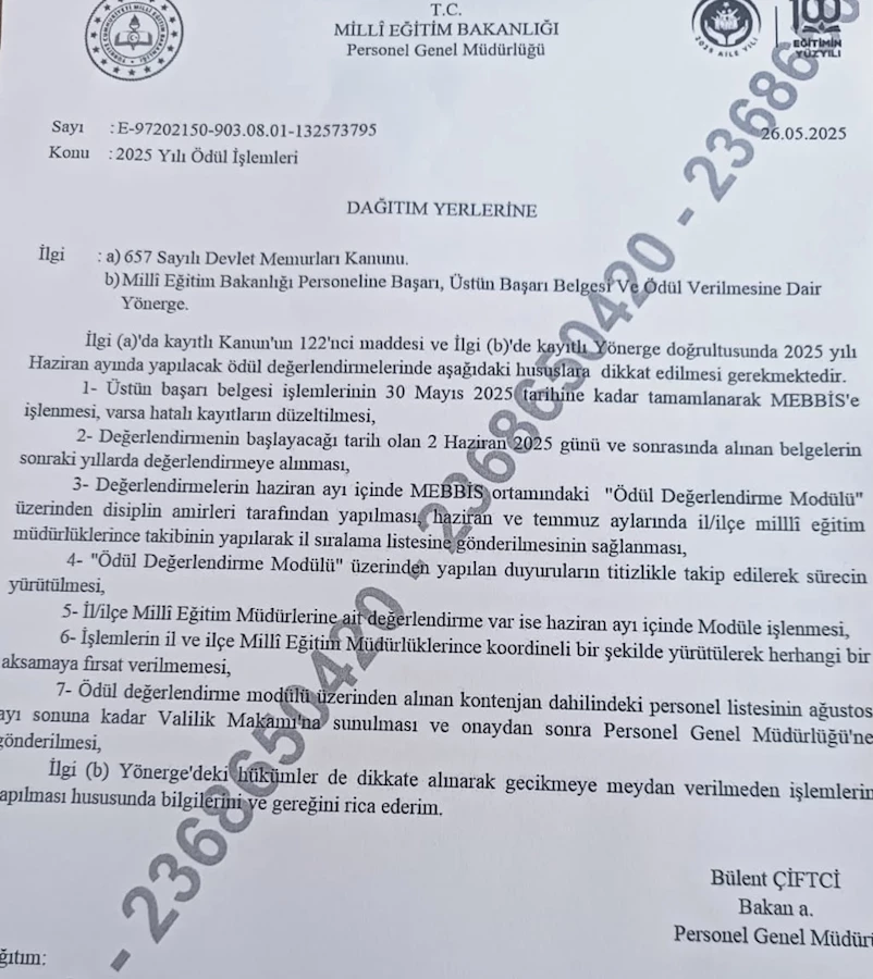 Personel Genel Müdürü Bülent Çiftci imzasıyla kurumlara gönderilen ve E-97202150-903.08.01-132573795 sayı numaralı "2025 Yılı Ödül İşlemleri" konulu yazı, ilgili tüm birimlere ulaştı. Yazıda, 657 Sayılı Devlet Memurları Kanunu'nun 122'nci maddesi ile Milli Eğitim Bakanlığı Personeline Başarı, Üstün Başarı Belgesi ve Ödül Verilmesine Dair Yönerge doğrultusunda Haziran ayında yapılacak ödül değerlendirmelerinde dikkat edilmesi gereken hususlar sıralandı: