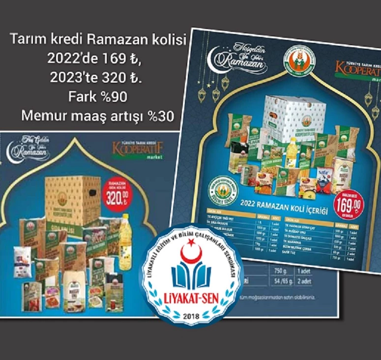 En ucuz market olarak ilan edilen Tarım kredi kooperatifi marketlerinde “ Ramazan paketi “ bir önceki yıla göre yüzde 90 oranında zamlandı. Ramazan pidesi ise 10₺’ye çıktı . Memur, emekli ve dar gelirli vatandaşlarımız Ramazan ayını zor geçirecek. #MemuraEkZam verin. #LiyakatSen