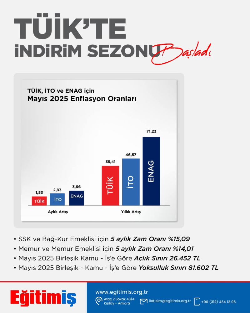TÜİK, Mayıs 2025 enflasyonunu %1,53 olarak açıklarken, Eğitim-İş bu oranın çarşıda ve pazarda yaşanan gerçek hayat pahalılığını yansıtmaktan uzak olduğunu vurguladı. Sendika, aynı dönemde İstanbul Ticaret Odası (İTO) tarafından açıklanan enflasyon oranının %2,83, bağımsız araştırma grubu ENAG'ın oranının ise %3,66 olduğunu hatırlatarak, TÜİK'in verilerinin "iktidar lehine manipülasyon yapan bir yapı olduğunu bir kez daha gözler önüne serdiğini" ifade etti. Bu ciddi farklılıklar, kamuoyunda enflasyonun gerçek boyutu hakkında tartışmaları beraberinde getirdi.